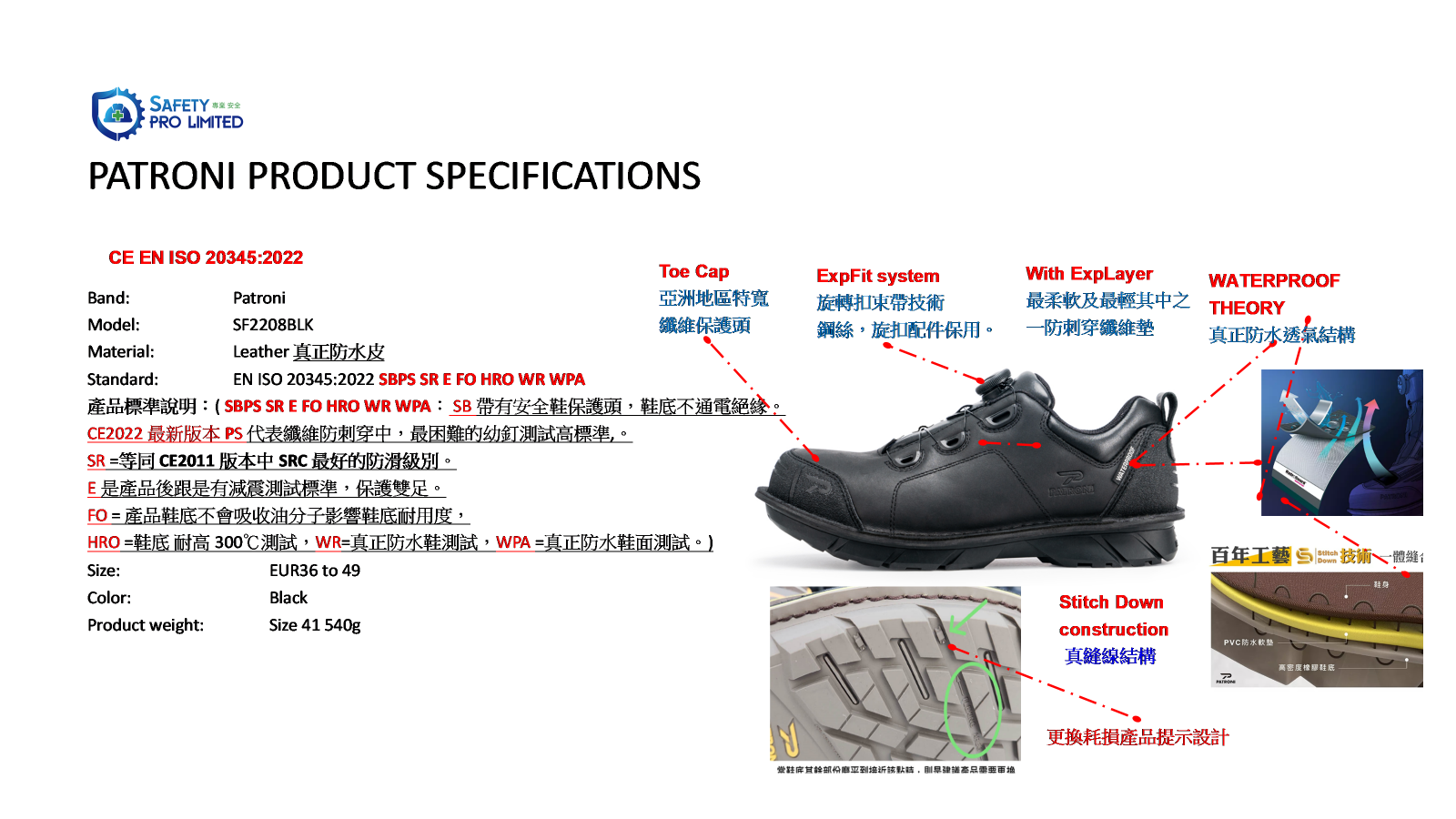 Band: Patroni Model: SF2208BLK Material: Leather 真正防水皮 Standard: EN ISO 20345:2022 SBPS SR E FO HRO WR WPA 產品標準說明: ( SBPS SR E FO HRO WR WPA: SB帶有安全鞋保護頭,鞋底不通電絕緣。CE2022最新版本 PS 代表纖維防刺穿中,最困難的幼釘測試高標準,。 SR =等同 CE2011版本中SRC 最好的防滑級別。E是產品後跟是有減震測試標準,保護雙足。 FO = 產品鞋底不會吸收油分子影響鞋底耐用度, HRO =鞋底 耐高300℃測試,WR=真正防水鞋測試,WPA =真正防水鞋面測試。) Size: EUR36 to 49 Color: Black Product weight: Size 41 540g